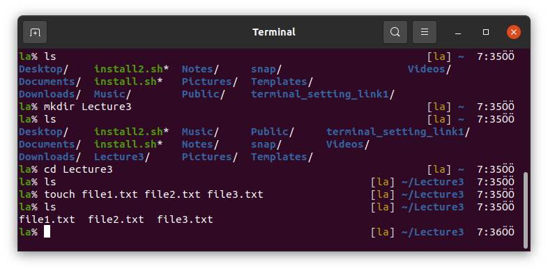 Let's make Lecture3 directory on your home directory and create three empty files in it.