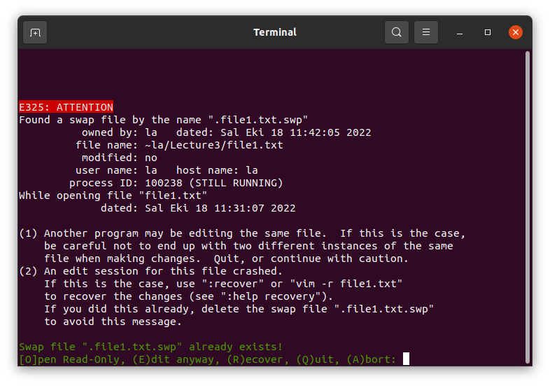 e to continue editing. In this case you will not be able to see the last changes,r to continue editing with the last changes,q to quit,a to abort.I do not use ctrl+z when I use Vim. If I do it accidentally, I just remove the hidden files to get rid of this warning.
