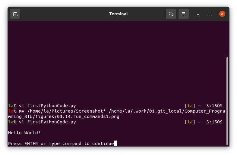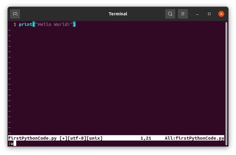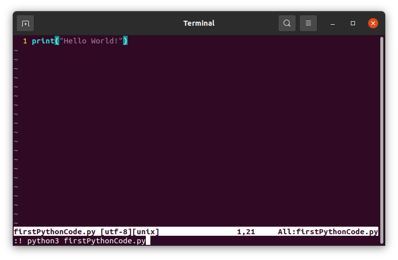 Use :! python3 firstPythonCode.py to run the code in the command mode.