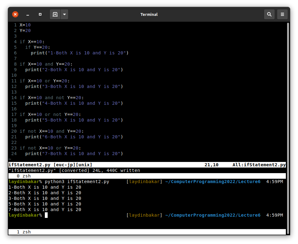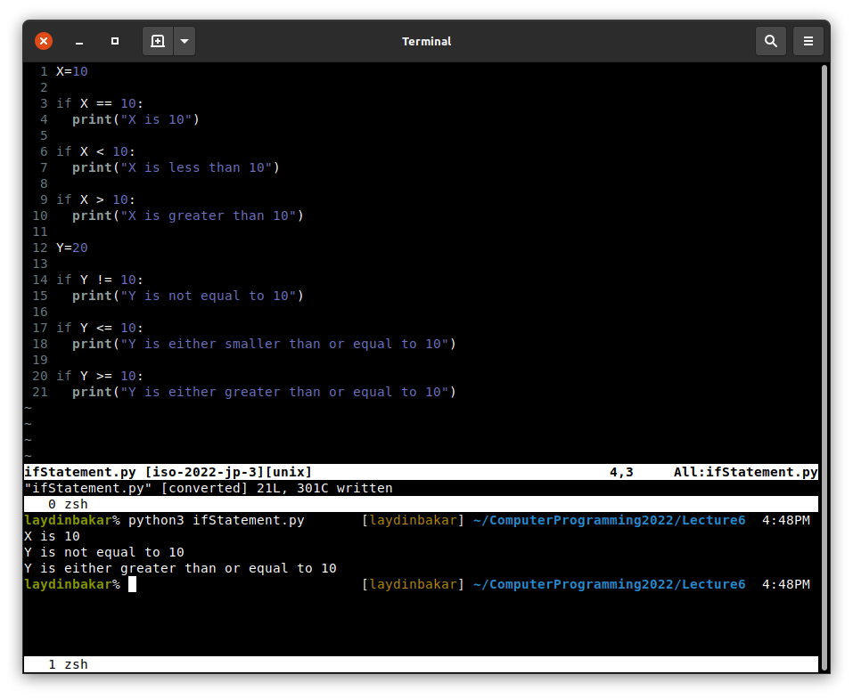 x == y is for x is equal to y,x != y is for x is not equal to y,x > y is for x is greater than y,x < y is for x is less than y,x >= y is for x is greater than or equal to y,x <= y is for x is less than or equal to y,An example script printing if variables X or Y are grater or less than or equal to 10 is below.